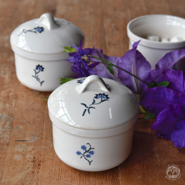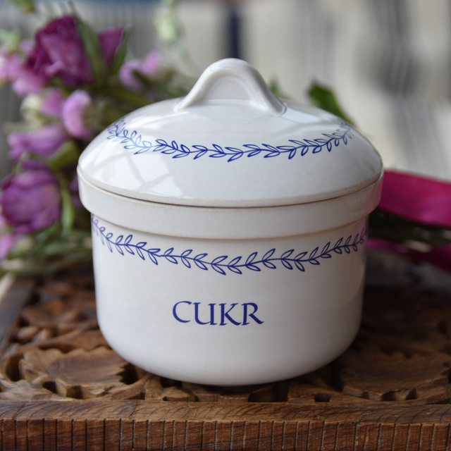 Při návrhu tvaru a rostlinného dekoru cukřenky jsme se inspirovali tradičními historickými dózami. Sádrové formy si vyrábíme sami v naší dílně. Výrobky odléváme z kameniny, glazujeme a pálíme na vysokou teplotu v keramické peci. Nádobí je odolné.