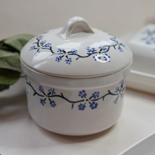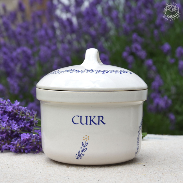 Kameninová cukřenka, dóza na cukr, je glazovaná bílou glazurou a ručně malovaná do syrové glazury nebo dekor zatavený na třetí výpal (dle varianty). Starobylý rostlinný vzor je na víčku i na spodní nádobě. Víčko má praktickou úchytku, která neklouže.