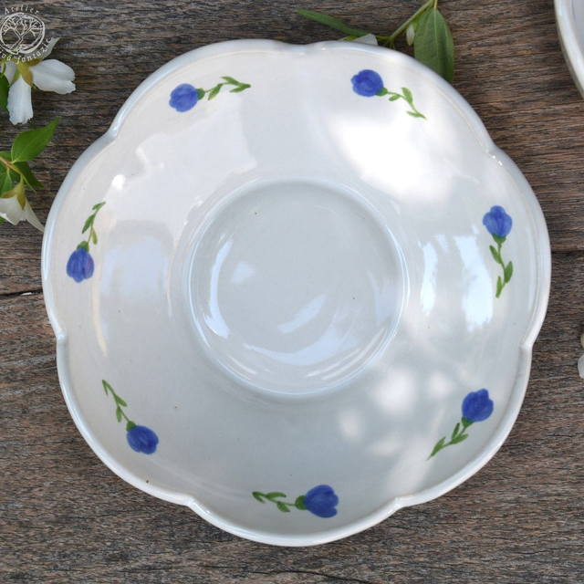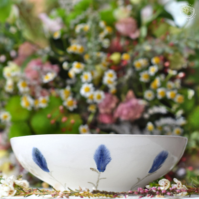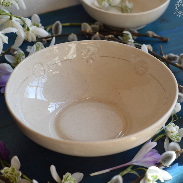 Nižší, širší ozdobná kameninová miska na salát, müsli, ovesnou kaši, polévku. Zvenku i zevnitř glazovaná bílou/ transparentní glazurou s různými dekory, dle varianty. Ručně litá a malovaná. Pálená na vysokou teplotu v keramické peci. Zespodu glazované podední. Každý kus je originál. Tenká a lehounká, střep slinutý a pevný. Vhodná pro mikrovlnnou troubu a myčku nádobí.
