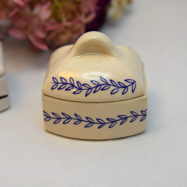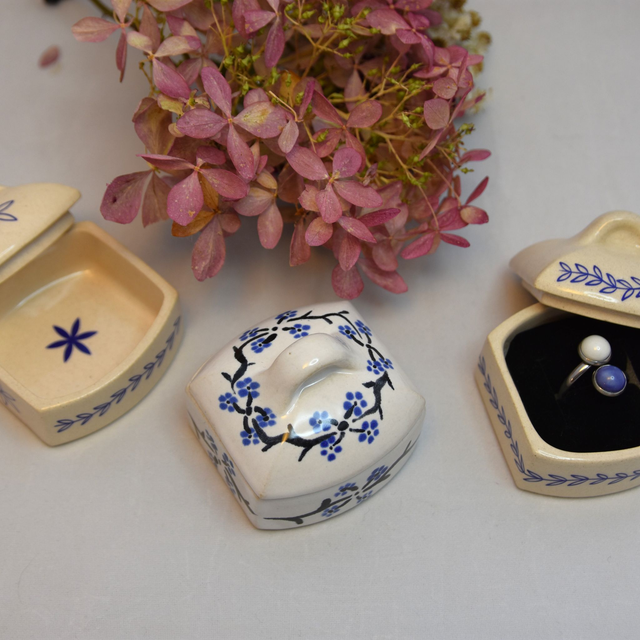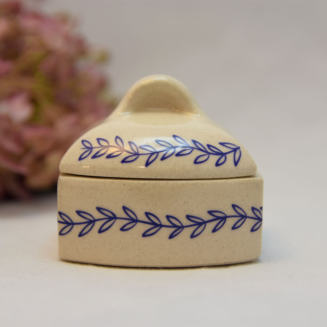 Kameninová malá krabička/dózička s víčkem na prstýnek nebo jiný šperk. Glazováno bílou glazurou + dekor větvičky na třetí výpal v keramické peci.