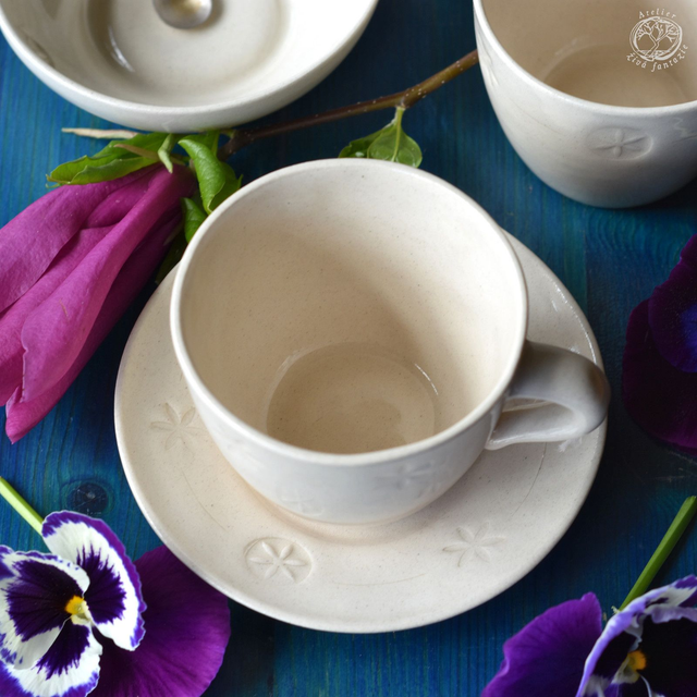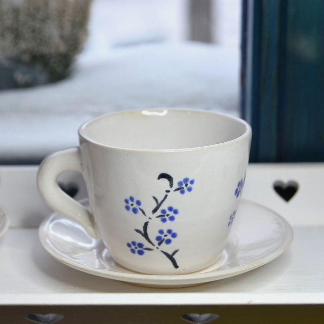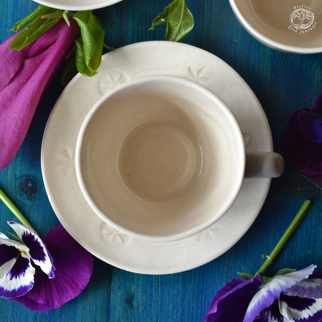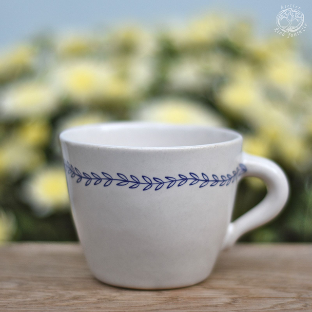 Kameninový šálek na čaj nebo cappuccino, zvenku i zevnitř glazovaný bílou/ transparentní glazurou a ručně malovaný do syrové glazury, dle varianty. Starobylý rostlinný vzor. Pálený na vysokou teplotu v keramické peci. Zespodu glazované podední. Každý kus je originál. Střep slinutý a pevný. Vhodné do myčky i mikrovlnky.