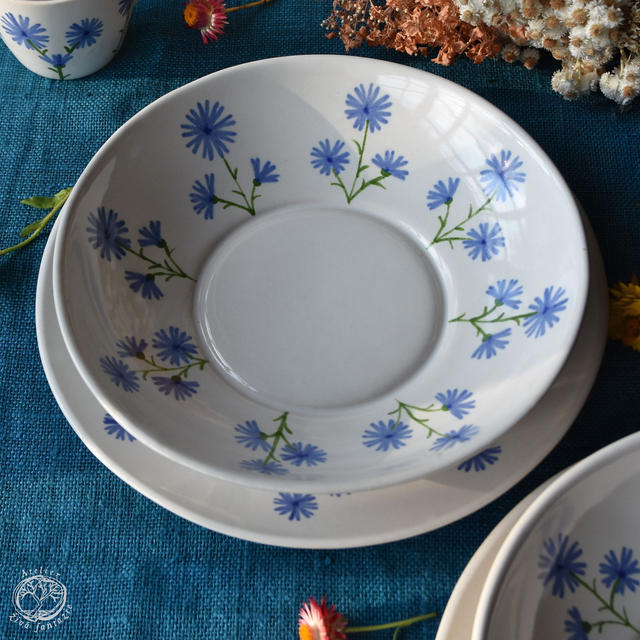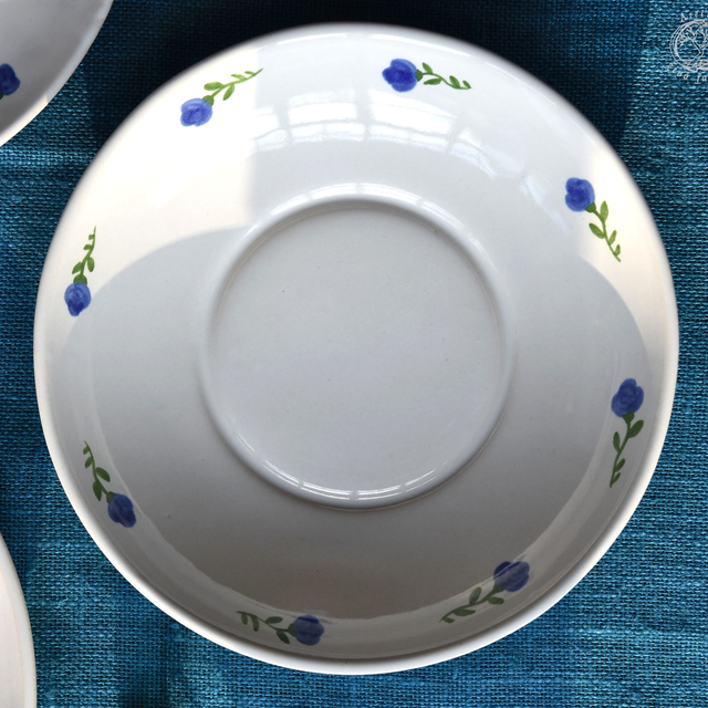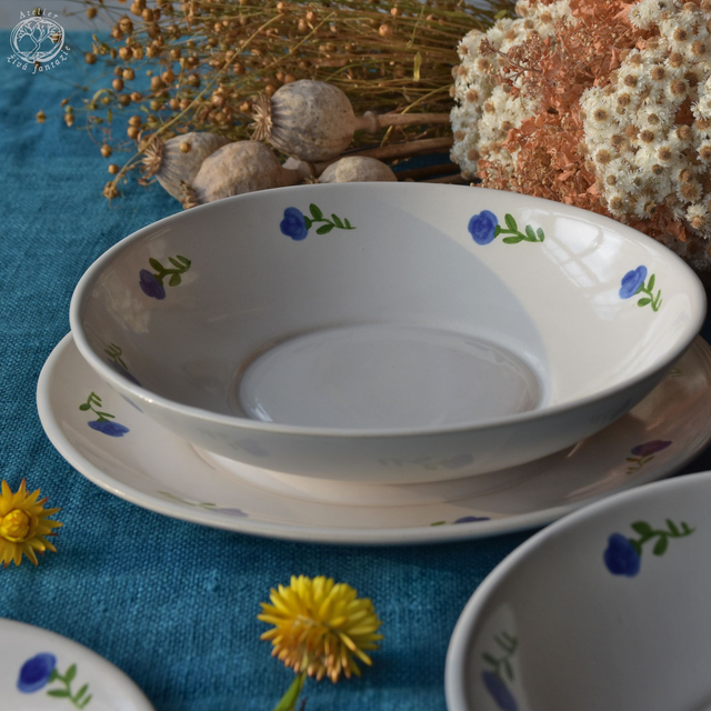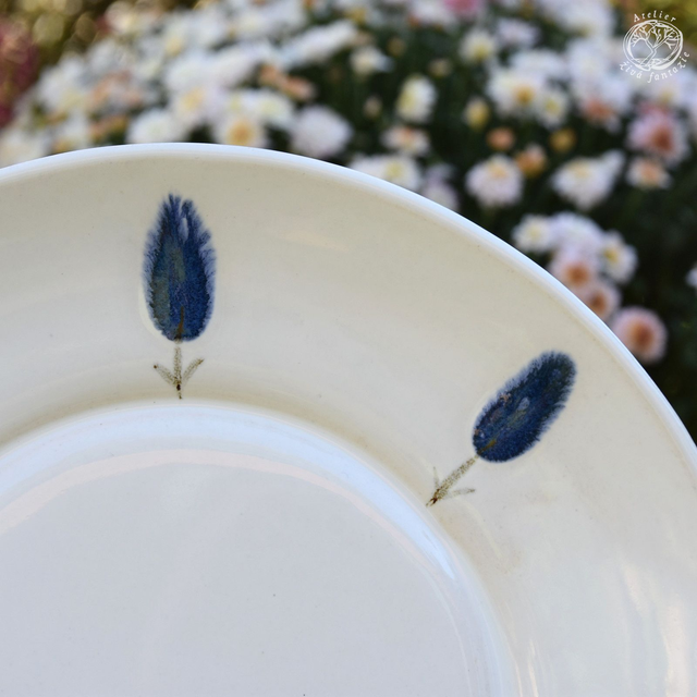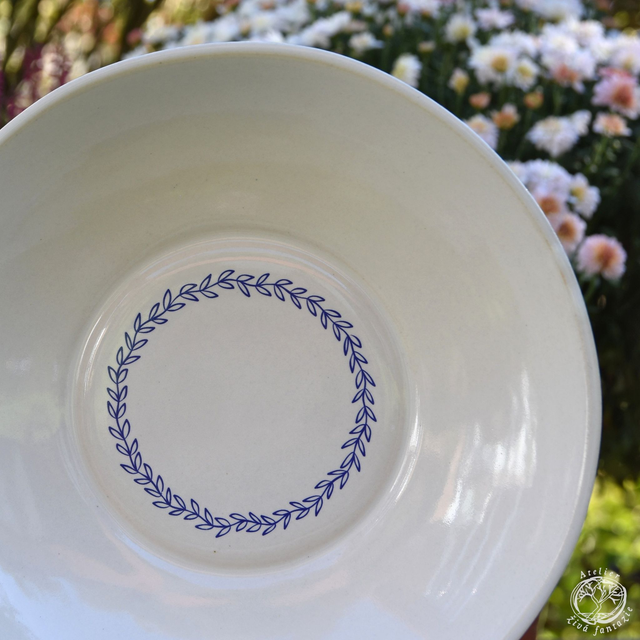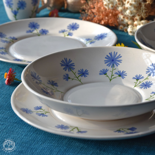 Kameninový talíř hluboký, lze použít i jako mísu např. na salát či ovoce. Je glazovaný bílou glazurou a ručně malovaný do syrové glazury/dekor na třetí výpal (dle varianty). Rostlinný vzor. Glazované podední. Nádobí je odolné, pálené v keramické peci na vysokou teplotu. Talíř se může dávat do myčky na nádobí i mikrovlnné trouby.