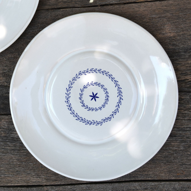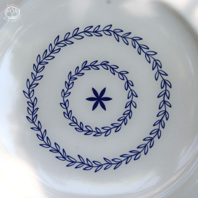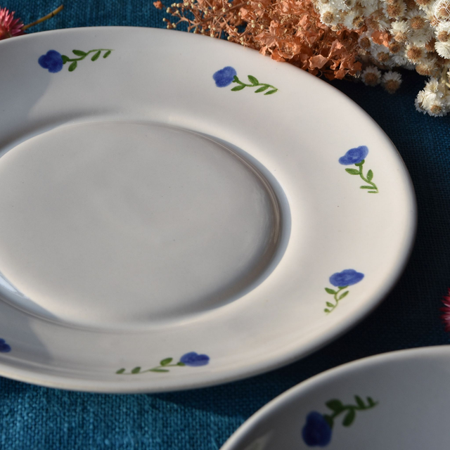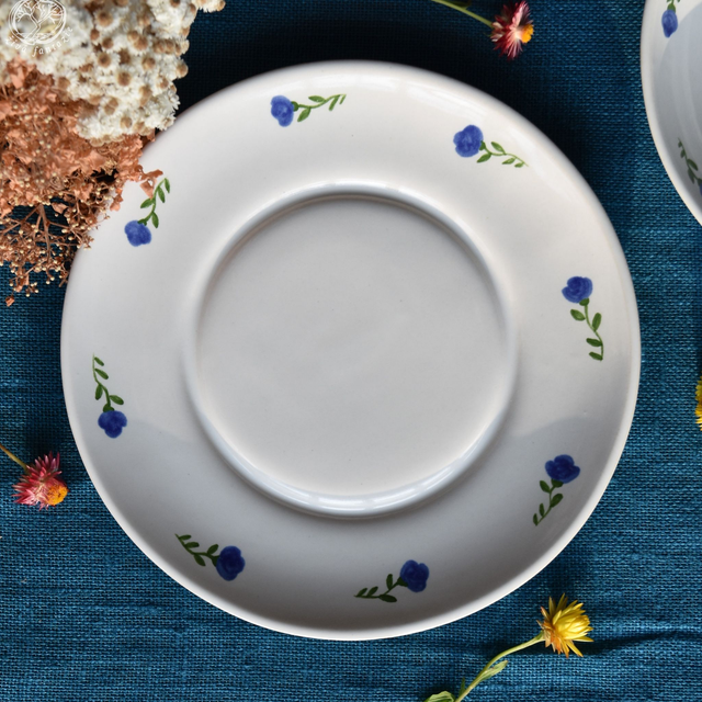 Kameninový talíř plytký/mělký, lze použít i jako servírovací např. na koláč. Je glazovaný bílou glazurou a ručně malovaný do syrové glazur / naglazurový dekor (dle varianty¨). Rostlinný vzor. Glazované podední. Nádobí je odolné, pálené v keramické peci na vysokou teplotu. Talíř se může dávat do myčky na nádobí i mikrovlnné trouby.