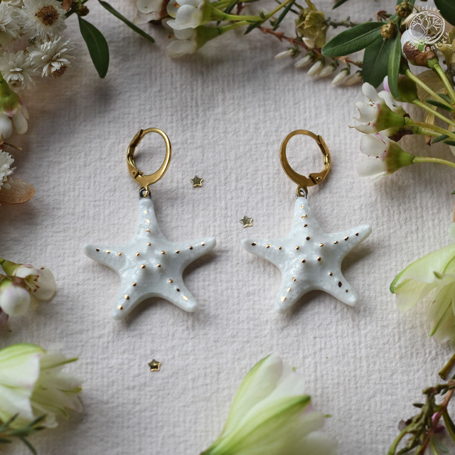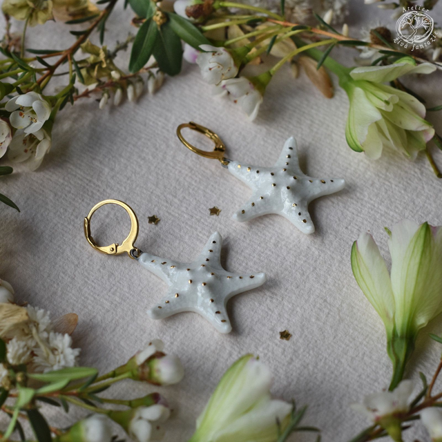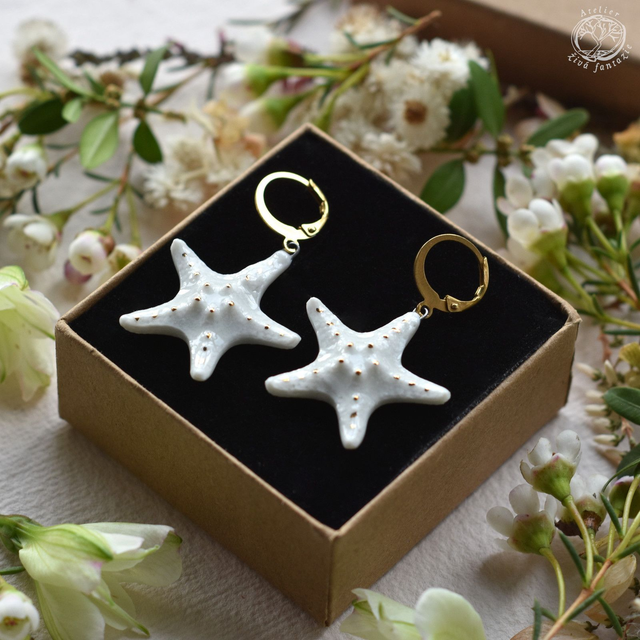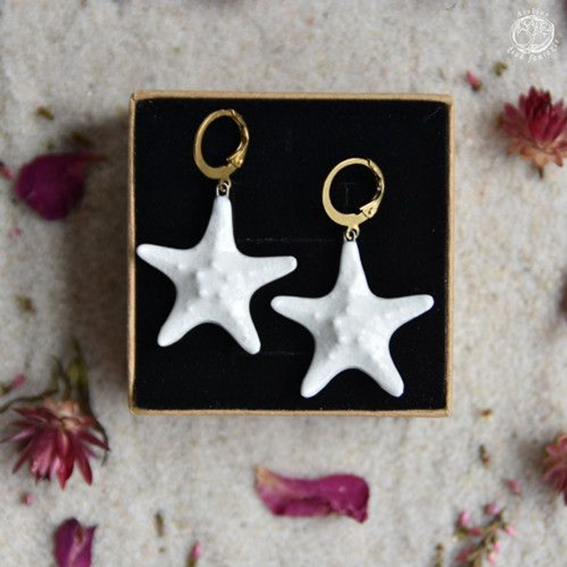 Porcelánové autorské visací náušnice z glazovaného porcelánu. Vznikly odlitím skutečných přírodnin z moře do porcelánu. Bílé nebo dekorované zlatem, dle varianty. Celoglazované. Jsou duté, takže jsou lehké.