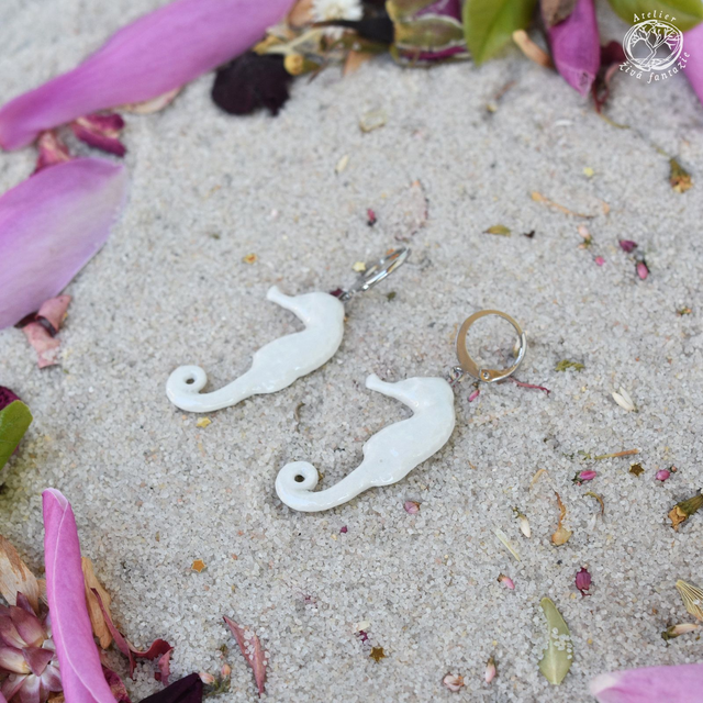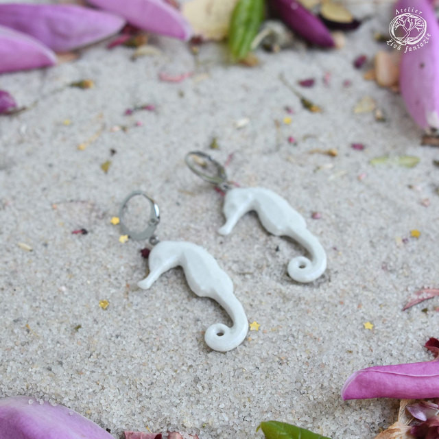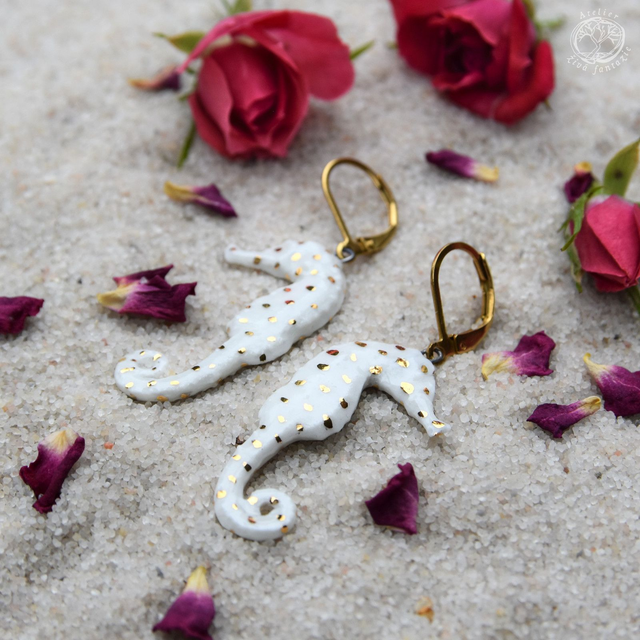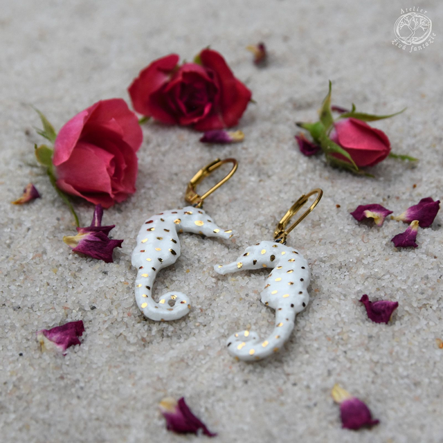 Porcelánové autorské visací náušnice z glazovaného porcelánu. Vznikly odlitím skutečných přírodnin z moře do porcelánu. Bílé nebo dekorované zlatem, dle varianty. Celoglazované. Jsou duté, takže jsou lehké.