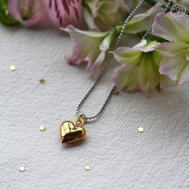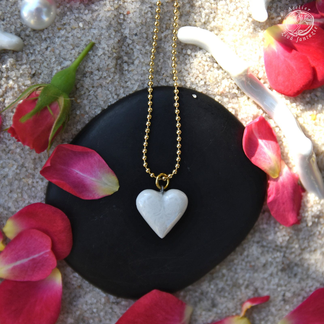 Porcelánový autorský náhrdelník Srdíčko s jemným reliéfem je glazované transparentní glazurou a pálené na vysokou teplotu. Uvnitř duté, takže je lehounké. Celoglazované, pozlacené nebo bílé dle varianty.