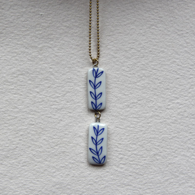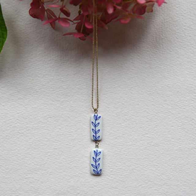 Dlouhý porcelánový autorský šperk s modrým větvičkovým motivem z glazovaného porcelánu s řetízkem z pozlacené chirurgické oceli. Dekor je zatavený do glazury na třetí výpal v keramické peci 820°C