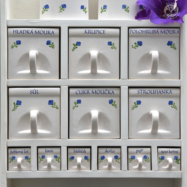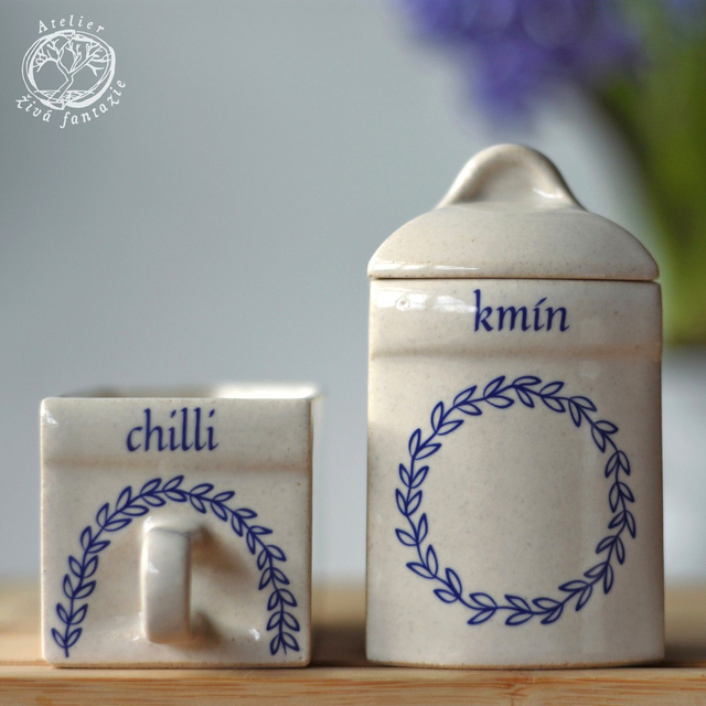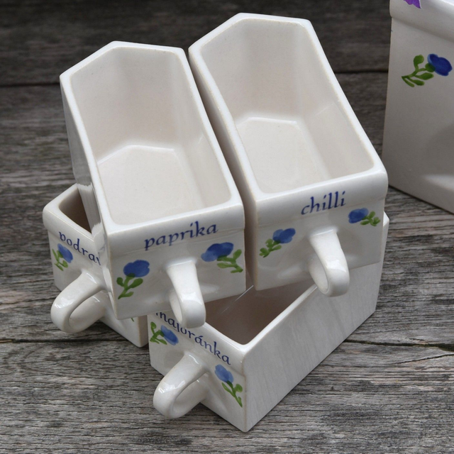 Při návrhu tvarů a rostlinného dekoru dóz a šuplíků jsme se inspirovali tradičními historickými kořenkami. Sádrové formy si vyrábíme sami v naší dílně. Pak do nich odléváme z kameniny a odlitky, glazujeme a pálíme na vysokou teplotu, aby dlouho vydržely.
