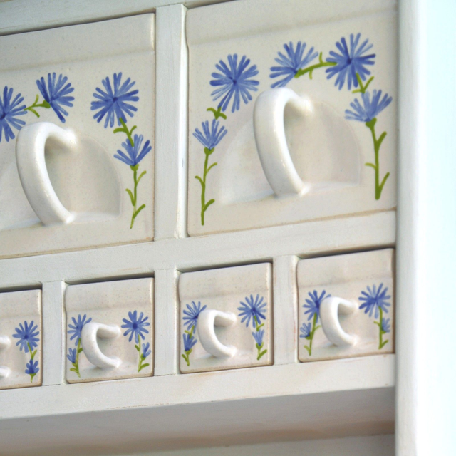 Glazováno bílou + ručně malovaný modrý rostlinný dekor. Páleno třemi výpaly v keramické peci.